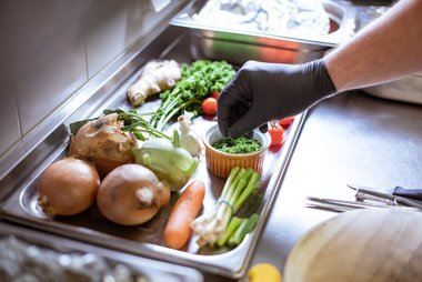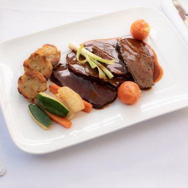 Das blanchierte Gemüse in einer Pfanne mit etwas Butter schwenken und mit Salz, Pfeffer und Muskatnuss abschmecken. Die fertigen Ochsenbackerl fingerdick in Scheiben schneiden und auf einer warmen Porzellanplatte mittig anrichten und mit der Sauce leicht bedecken, den Rest extra reichen.