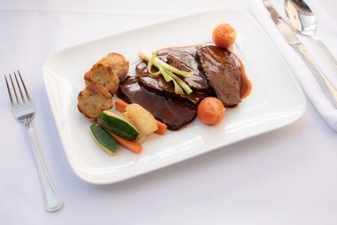 Die fertigen Ochsenbackerl fingerdick in Scheiben schneiden und auf einer warmen Porzellanplatte mittig anrichten und mit der Sauce leicht bedecken, den Rest extra reichen. Das Buttergemüse von 2 Seiten schön anrichten und eventuell mit gehackter Petersilie bestreuen.