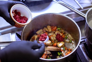 Die Sauce durch ein feines Sieb streichen und den angedrückten Knoblauch, Vanillestange und Ingwer für 10 Minuten mitköcheln lassen. Zum Schluss herausnehmen und die fertige Sauce mit etwas Speisestärke abbinden und nochmal abschmecken. Es soll ein feiner, leicht herber Biergeschmack merkbar sein.