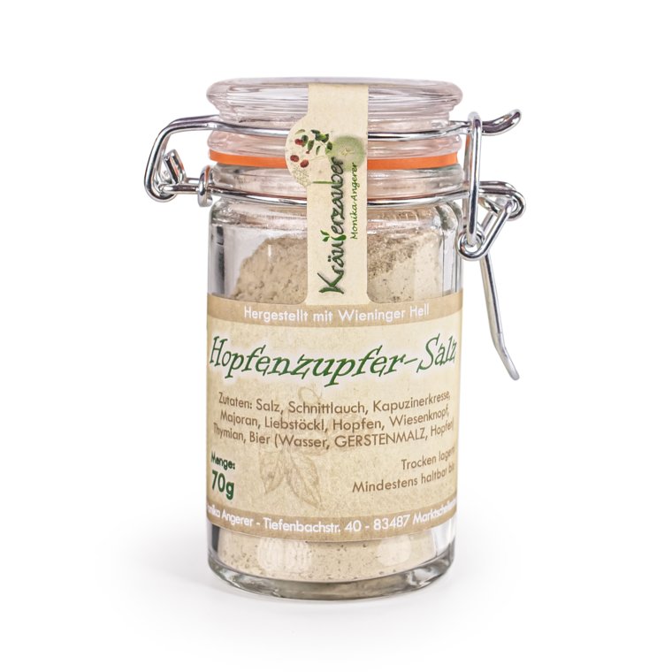 Hopfen und Salz, Gott erhalt`s! Unser herrlich würziges Wieninger Hopfenzupfer-Salz ist alles, was ein Butterbrot braucht. Verfeinert mit würzigen Kräutern, duftendem Hopfen und unserem Teisendorfer Hell wird das wertvolle Salz aus dem Berchtesgadener Land zu einem wahren Geschmackserlebnis! Die feinen Kräuteraromen und der würzige Hopfengeschmack bringen Ofenkartoffeln und Schnittlauchbrote geschmacklich in Top-Form!